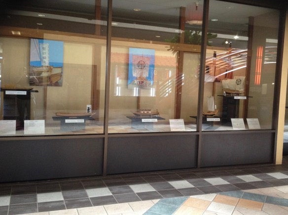 The sixth display of wasen models is now set up at the Japan Center Mall in the window of the Union Bank Community Room inside the East Mall building. The display will be up through the end of March and features the same models as before, but with the addition of my Kamakura Period Sea Boat or Umi-bune. Though the Umi-bune model is not quite complete, I figured it was far enough along for public display as an “in progress” model.