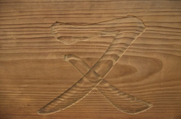 On the face of the todate is a carved symbol of the owner. I don’t know a whole lot about these, but was told it was a yago. That doesn’t make a lot of sense to me, as I thought a yago was a house name. The above is a from the plans I’m using. It shows what appears to be twin mountain peaks inscribed in a circle – clearly not a name. The other plan shows what looks like a Chinese character. It looks similar to this one, 又, but it doesn’t make much sense as it is the word mata, which means “also”.