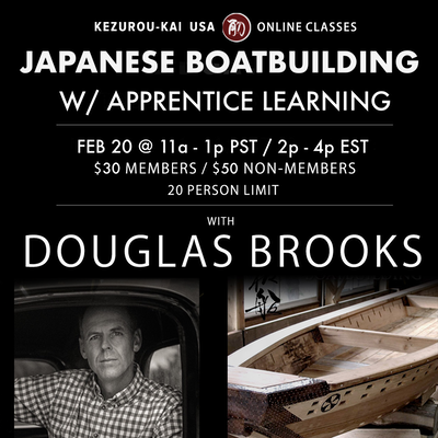Sorry for the short notice, but there is an online workshop this Saturday, Feruary 20th, from 11am to 1pm PST. That’s 2pm to 4pm Eastern. The Zoom-based workshop is being hosted by Kezurou-Kai USA and there is a fee of $50 for non-members and $30 for members. Douglas will be discussing the building of Japanese boats under the traditional Japanese apprentice learning system.