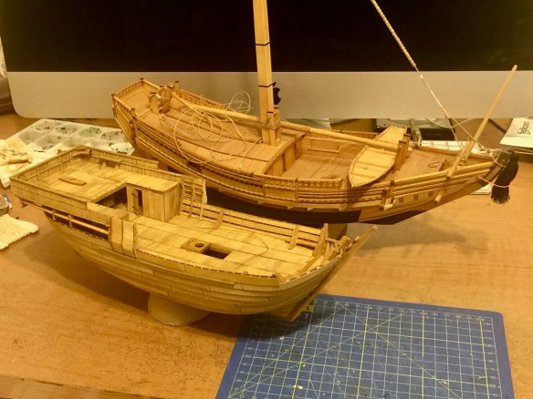After some time off to finish a medieval European cog model and to gain some ground on a couple other ship modeling projects, I started working on wasen models again. It is interesting, though, to have the cog model and a sengokubune model (the Kitamaebune is a class of sengokubune, a common term for this type of coastal transport), sitting close together, as they are both in 1/72 scale.