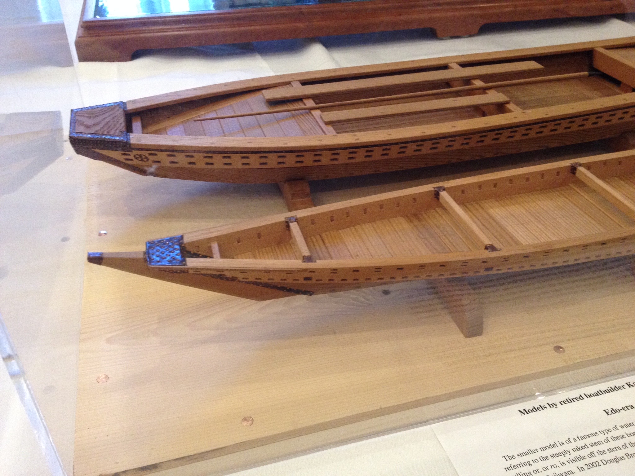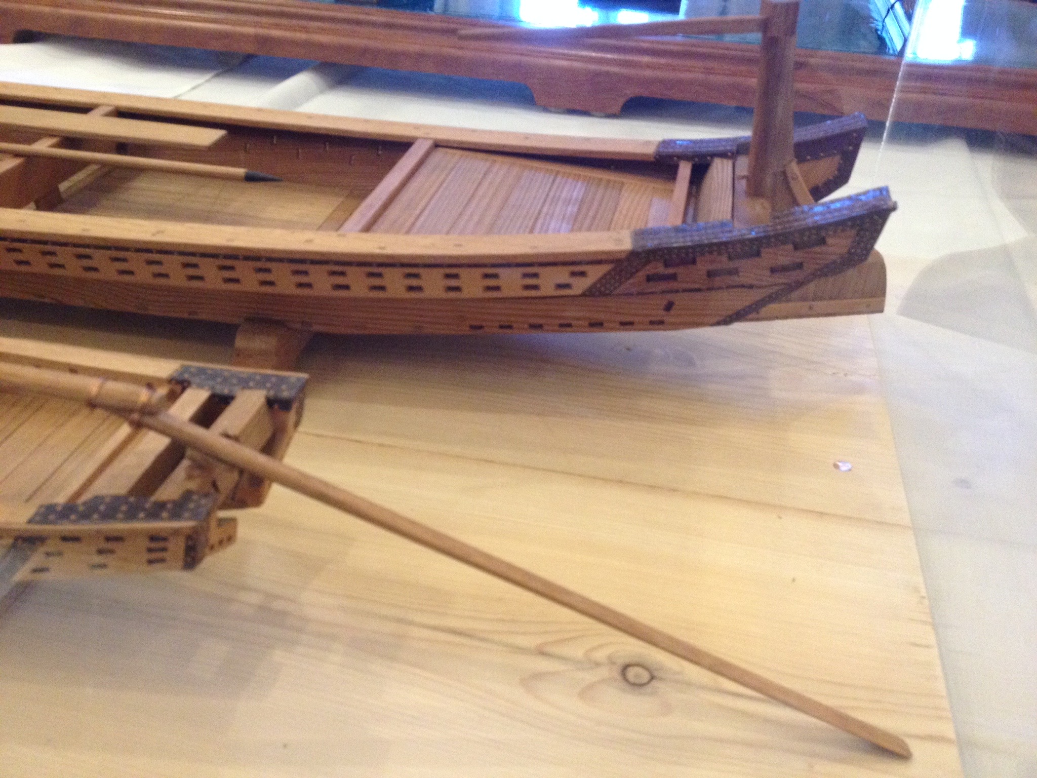 I don’t know if the boards that make up these decks were removable. Underneath, I left the ends open, so things could be tucked in there for storage, but only for smaller things, as the support posts of the beams cut the openings in half. If the deck beams were removable, there should be finger holes in at least some of the deck boards, so they could be easily lifted up. Sometimes, there was also a V-shaped pattern inscribed across the boards to make it easier to identify which boards go where. This is less important at the bow, where the boards lengths vary greatly, making them more easily identifiable as to which one goes where.